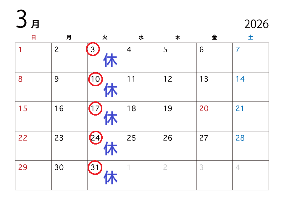 3月の店休日が決まりました。ご予約の参考にどうぞ。